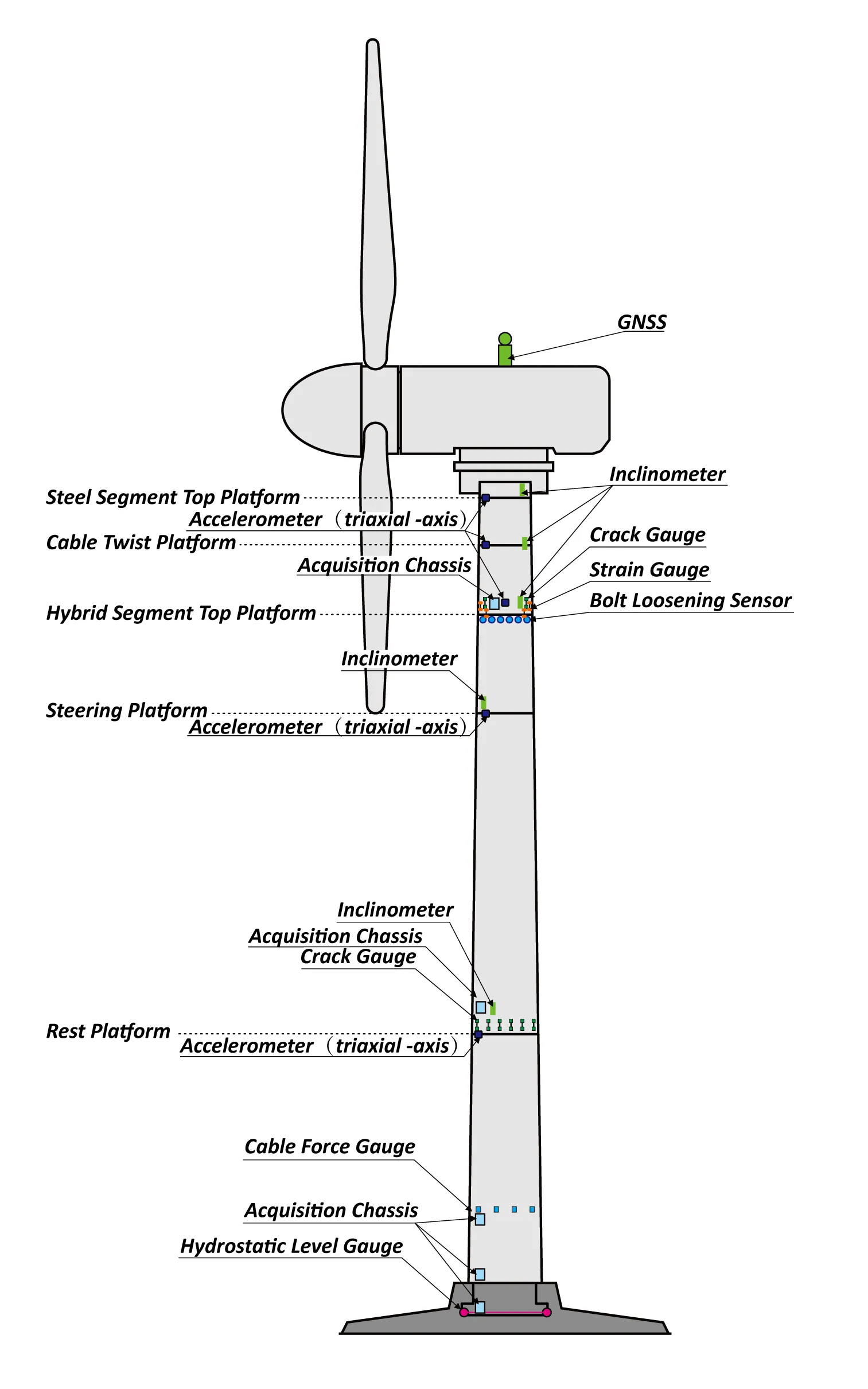Bằng cách lắp đặt các cảm biến có liên quan trên tháp tuabin gió để theo dõi tình trạng, nội dung giám sát chính cho các bộ phận kết cấu tháp tuabin gió phải bao gồm: giám sát độ rung của tháp, giám sát độ nghiêng của tháp, giám sát ứng suất của phần chuyển tiếp trên cùng, giám sát vết nứt thân tháp, giám sát dịch chuyển tháp, giám sát độ lún nền tháp, giám sát lực cáp, v.v., để đạt được mục tiêu vận hành an toàn các tháp tuabin gió.